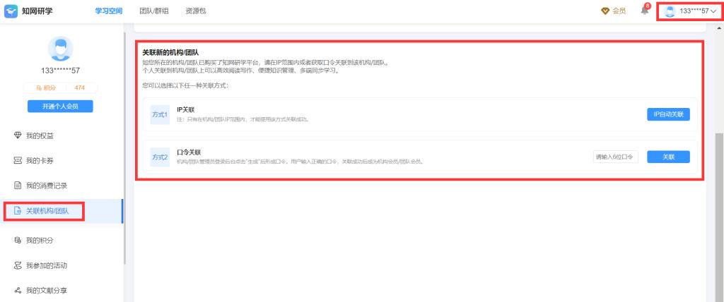 电脑端:在登录网址x.cnki.net后,点击右上角的个人头像,进入个人中心-关联机构/团队加入团队成功后,就可以免费使用知网研学网页端、手机端和桌面端,不受学校IP范围的限制。