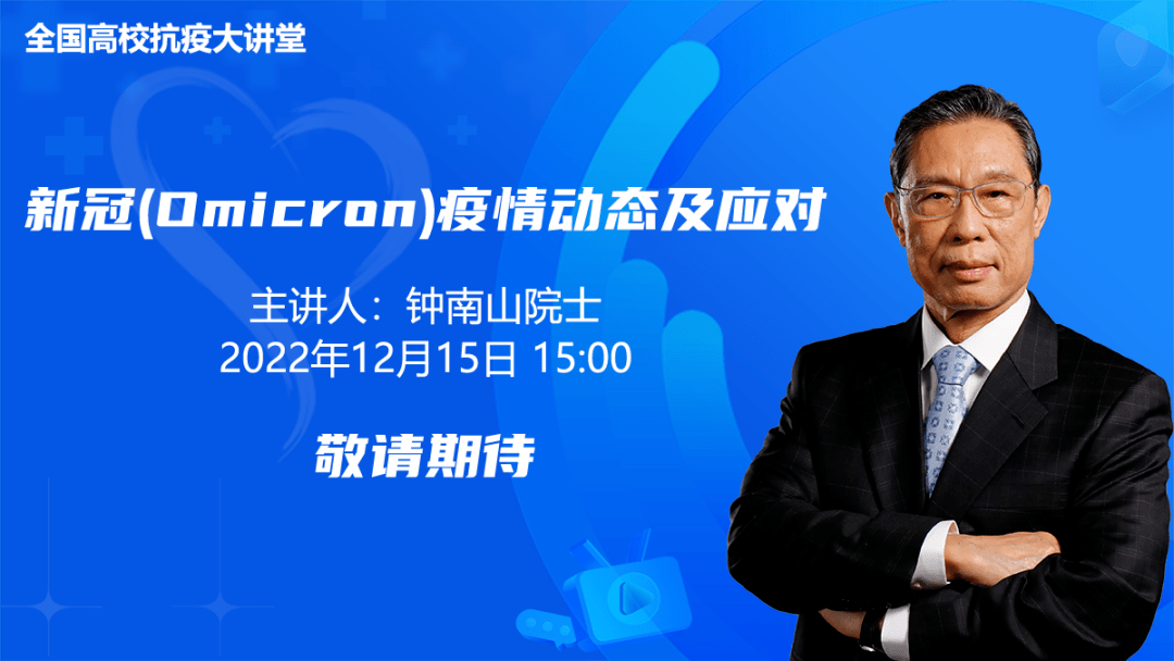 2022 年 12 月 15 日(周四)下午 15 点,全国高校抗疫大讲堂将邀请钟南山院士给全国高校学生上一堂科学防疫大课,题目为新冠(Omicron)疫情动态及应对。届时,国家智慧教育平台、微言教育、中山大学、北京大学、清华大学、中国大学生在线、易班网以及新华社、人民日报、新华网、央视频等中央主要新闻媒体所属网站、新媒体平台将进行同步直播。