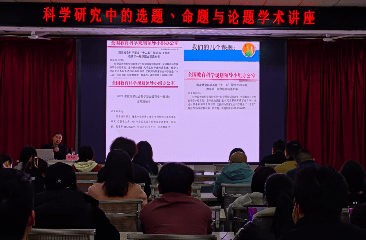 最后,胡教授围绕科研论题展开讲解,重点分析了论题的构建逻辑与论证方法。他指出,论题是命题的延伸与深化,是科研研究的核心论证对象,构建论题需遵循“提出问题—分析问题—解决问题”的逻辑主线,既要明确论题的核心观点,又要搭建清晰的论证框架。他结合自身参与的重大科研项目,分享了论题论证过程中的重点与难点,提醒大家要注重论据的真实性、科学性与关联性,合理运用文献研究法、实证研究法等多种研究方法,让论题论证更具说服力。同时,他鼓励青年教师在论题研究过程中,要勇于探索、大胆创新,敢于提出自己的独到见解,同时也要注重学术严谨性,杜绝学术不端行为。