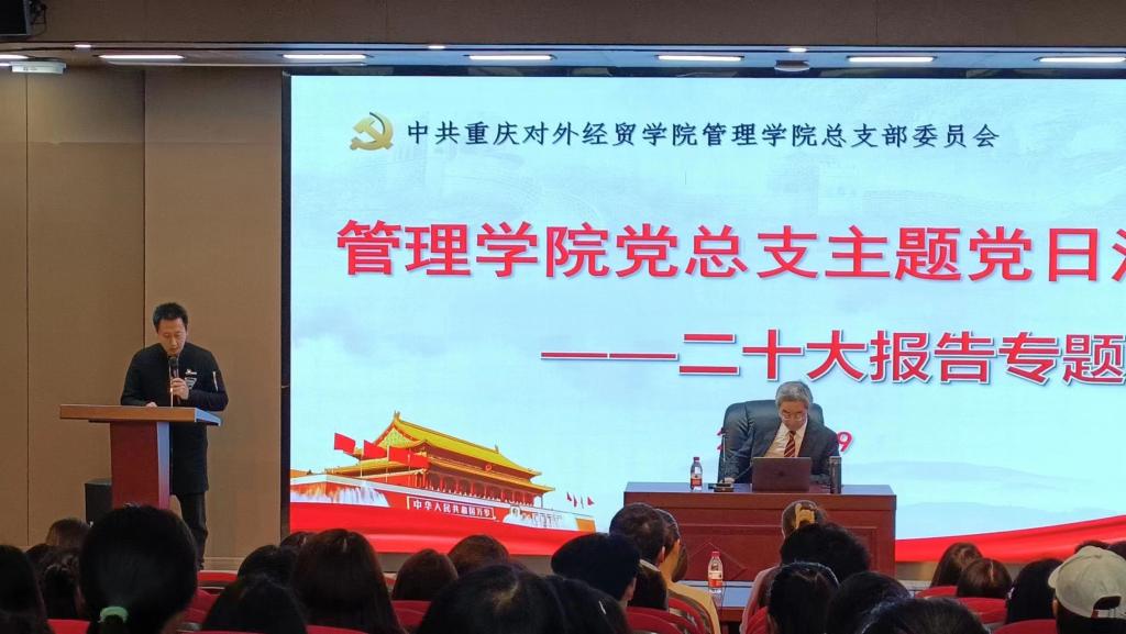为深入学习党的二十大精神,全面贯彻习近平新时代中国特色社会主义思想,管理学院于3月9日在合川B校区举办了“以中国式现代化全面推进中华民族伟大复兴---中国共产党二十大精神解读” 为主题的三江大讲堂讲座。讲座由中共重庆市委党校(重庆行政学院)三级教授、硕士生导师、 MPA导师、小平干部学院特聘教授、重庆对外经贸学院教授崔如波教授担任主讲人。本次活动由周万春书记主持,管理学院教师代表、优秀学生党员、入党积极分子都参与了此次讲座。