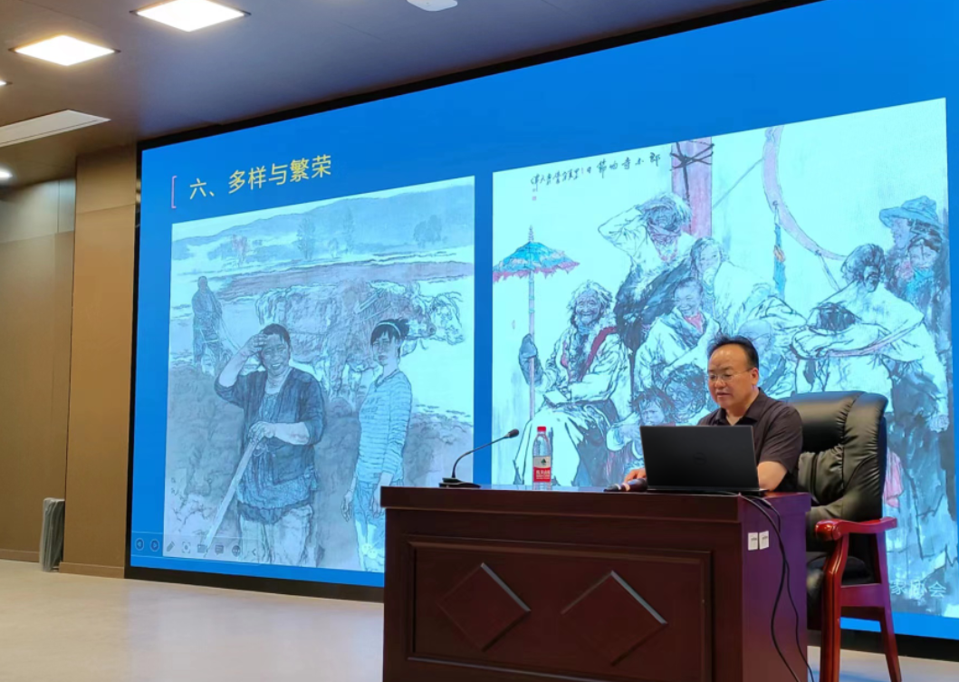 2023年5月28日晚上七点,艺术设计学院在合川B校区开展了由西南大学美术学院陈建华教授主讲的“以美育人、以美培元”系列之《新中国画运动与当代写意画》主题讲座。艺术设计学院艺术教育教研室的教师们与艺术设计学院各个专业的同学共同聆听了本次的讲座。