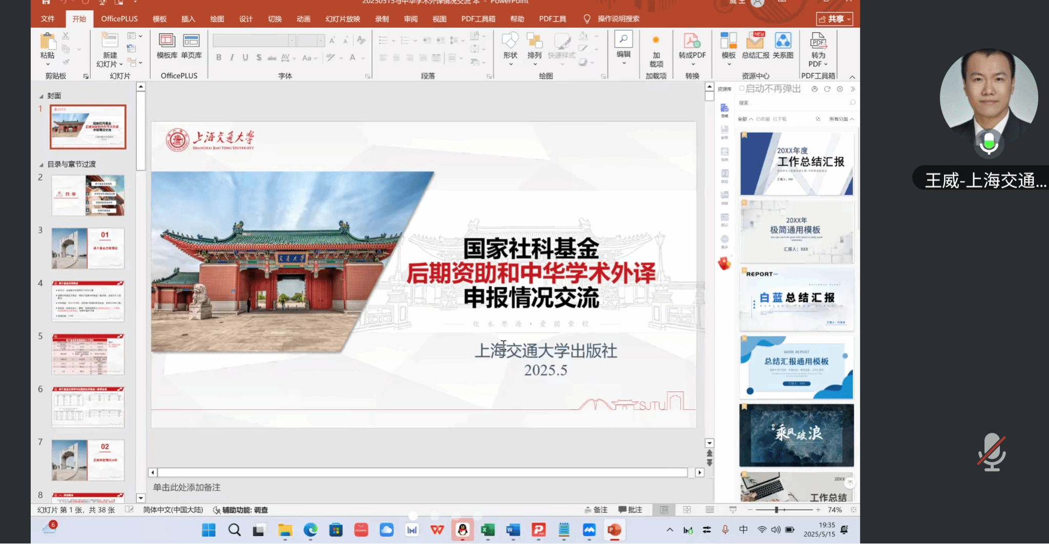 2025年5月15日,科研处举办的“国家社会科学基金中华学术外译项目申报讲座”以线上形式顺利开展。上海交通大学出版社国际合作部副主任、首席编辑王威担任主讲嘉宾,浙江越秀外国语学院科研处副处长王佳桐作为特邀嘉宾,学校科研处副处长顾晓蓓,外语外贸学院院长李霓及翻译专业教师共同参与了此次讲座。